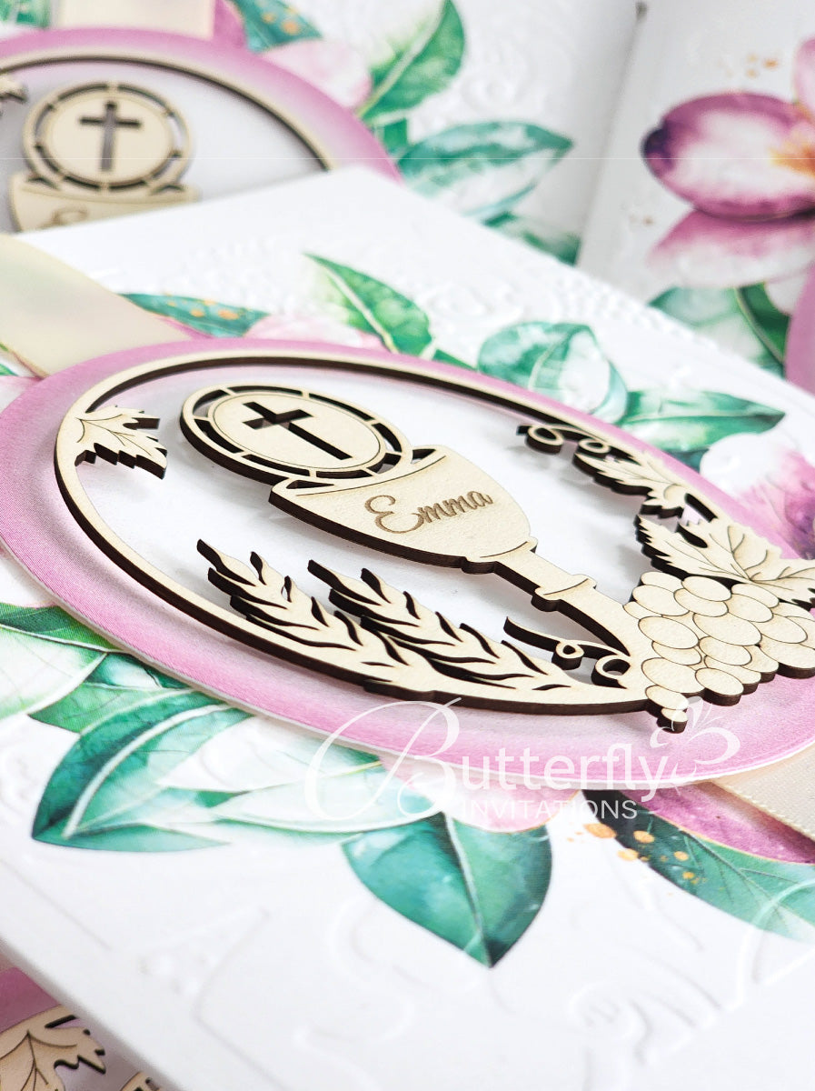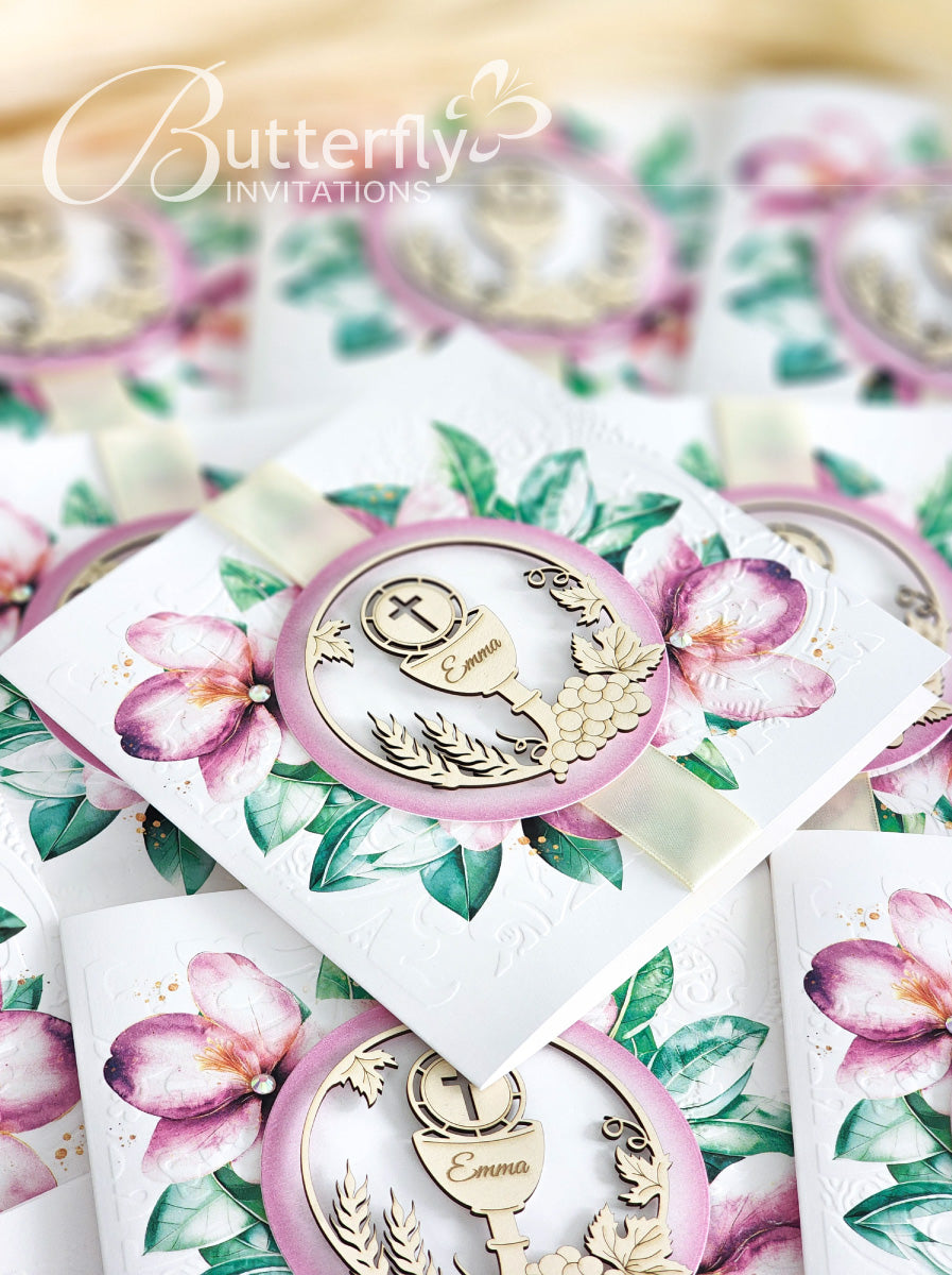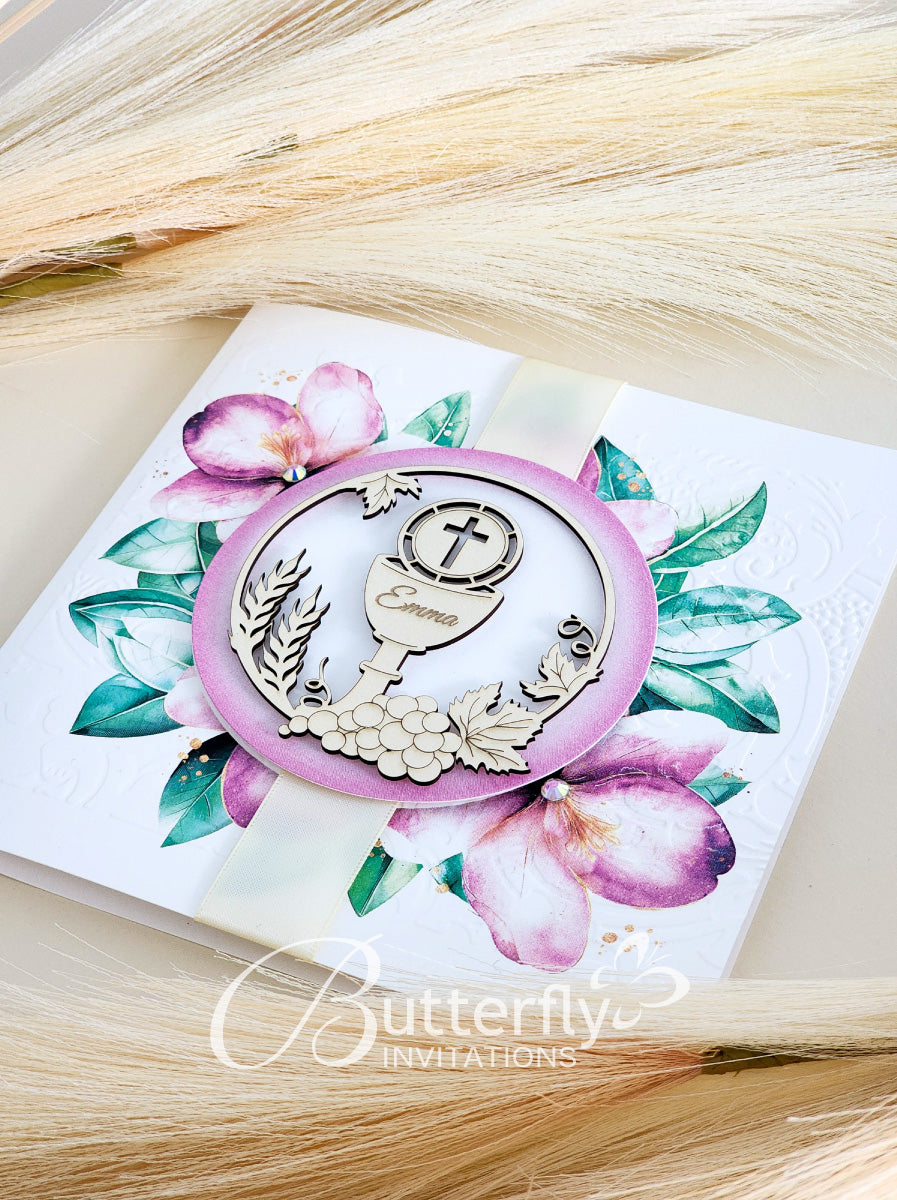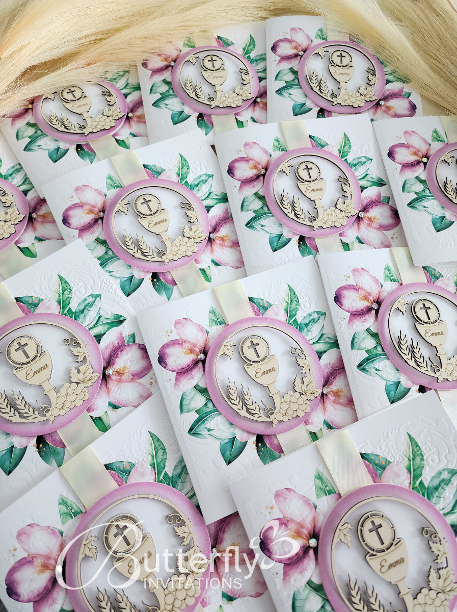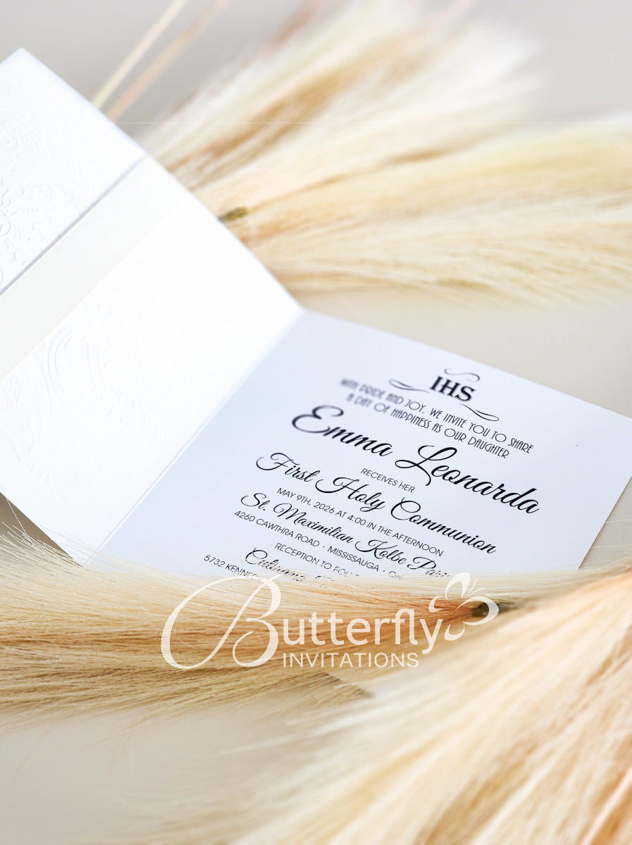 Announce your child's special day with the elegant First Communion Invitation #24. Featuring an engraved child's name along with the sacred First Holy Communion details, this invitation is sure to make a lasting impression. Share the joy of this milestone event with loved ones through this beautiful invitation.