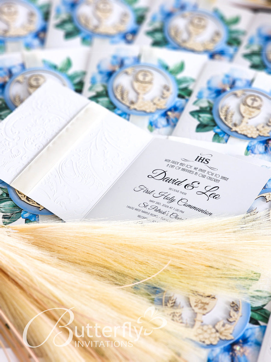 Announce your child's special day with the elegant First Communion Invitation #23. Featuring an engraved child's name along with the sacred First Holy Communion details, this invitation is sure to make a lasting impression. Share the joy of this milestone event with loved ones through this beautiful invitation.